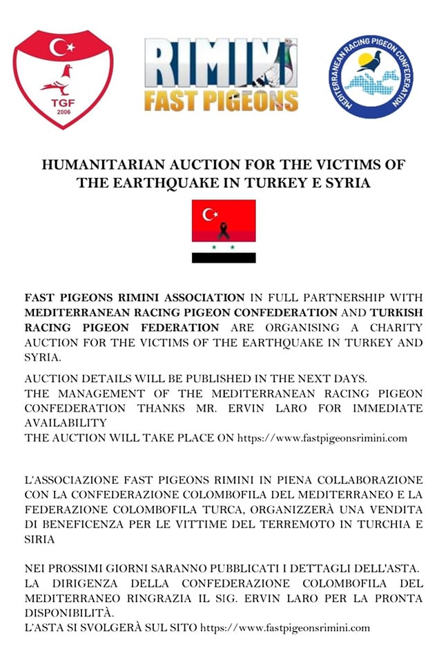 FCI çatısı altında yeni kurulan ''AKDENİZ YARIŞ GÜVERCİNİ KONFEDERASYONU''na Türkiye Güvercin Federasyonunun kurucu üye olduğu haberini vermek için konfederasyonun resmi açıklamasını beklemiştik. Yaşadığımız deprem felaketi yüzünden camiamız için atılan bu önemli adım hakkındaki açıklamayı ertelemiştik. Bugün Konfederasyon ülkeleri olarak depremzedeler yararına yapılacak yardımların ilk ayağı olarak açık artırma yapılacağı haberi yayınlandığı için konunun içeriğini bilgilerinize sunuyorum.1. AKDENİZ GÜVERCİN KONFEDERASYONU
